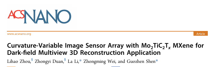 论文详情:Lihao Zhou, Zhongyi Duan, La Li*, Zhongming Wei and Guozhen Shen*. Curvature-Variable Image Sensor Array with Mo2TiC2Tx MXene for Dark-field Multiview 3D Reconstruction Application. ACS Nano, DOI.org/10.1021/acsnano.6c00364.