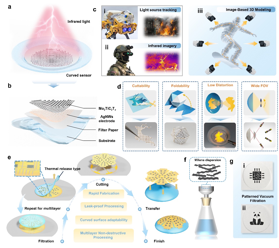 团队受纸质电子启发,创新提出热释放胶带辅助的无添加剂真空过滤工艺。选用双金属Mo2TiC2Tx MXene为光敏层、银纳米线为电极,利用胶带作为掩膜实现多层无损图案化,加热后可快速自动剥离保护底层结构。平面器件经激光切割后,可转移至3D打印的凸/凹基底,实现曲率灵活可调。应用验证显示,凸面传感器赋予机器狗180°超宽视场,使其能根据红外光源方向执行多种智能导航动作;凹面传感器则完美匹配透镜佩兹瓦尔面,实现了单镜片广角低畸变成像。更令人瞩目的是,由多个凹面传感器组成的阵列在暗场环境下,成功完成了基于多视角成像的物体3D空间重构。该器件基于光热效应工作,具备优异的稳定性与柔性。