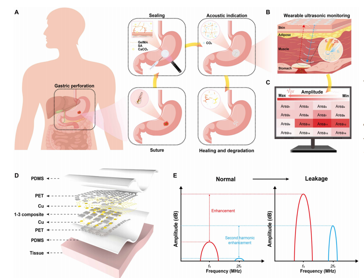 近日,欧美三级片 柔性电子器件与智造研究所沈国震教授团队在国际知名期刊《Science Advances》上发表题为“Bioresorbable acoustic patch for simultaneous sealing and early detection of gastric leakage”的研究论文。该研究首次将酸响应声学水凝胶与可穿戴柔性超声阵列相结合,实现了术后吻合口漏的无线、无创、持续监测与主动封堵,为胃外科术后管理提供了全新范式。