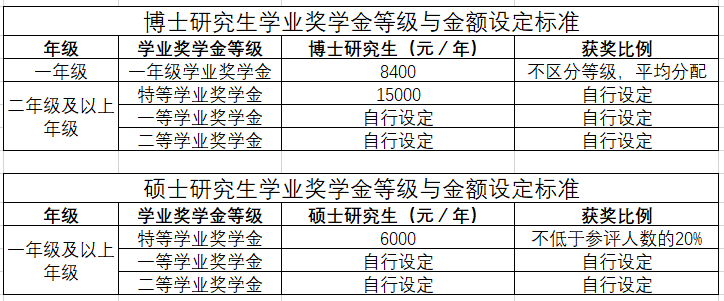1.博士研究生奖励标准:欧美三级片 根据核定人数,按每年人均不低于8400元下发各单位分配额度,各年级奖励等级与标准由欧美三级片 制定。原则上分三个等级,并设定金额级差。其中,一年级博士研究生学业奖学金不分等级,三年级及以上博士研究生须设立特等奖学金,奖励金额不低于每生每年15000元,奖励比例不低于参评人数的10%。