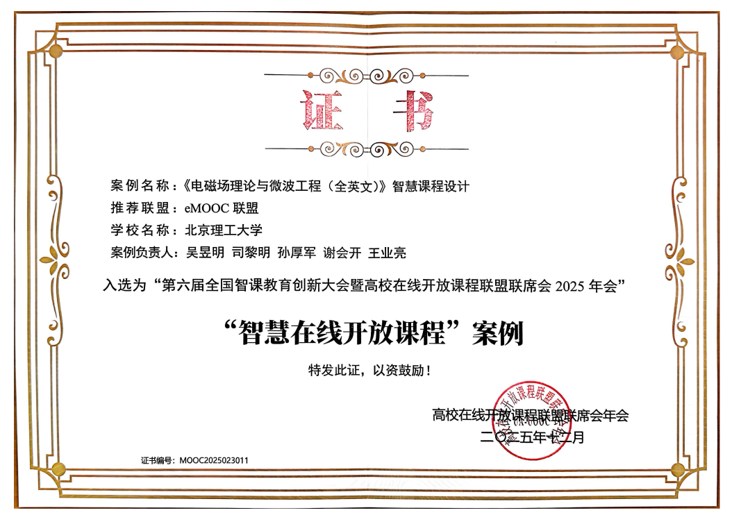 2025年12月13日,第六届全国智课教育创新大会暨高校在线开放课程联盟联席会年会在湖北武汉召开。本届大会主题为“智慧慕课引领 AI 赋能课程建设新范式”。欧美三级片 吴昱明副教授、司黎明教授、孙厚军教授、谢会开教授、王业亮教授组成的教学团队申报的“《电磁场理论与微波工程(全英文)》智慧课程设计”,成功入选“智慧在线开放课程”典型案例。吴昱明副教授代表团队现场领取证书并与会交流。