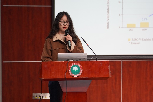第九届集创赛全国一等奖获得者、电子科学与技术专业2023级本科生唐千捷发言。她以自己的参赛经历出发,从选题组队、备赛技巧等方面分享了个人收获感悟,为此次参赛的同学们传授了宝贵的实战经验。